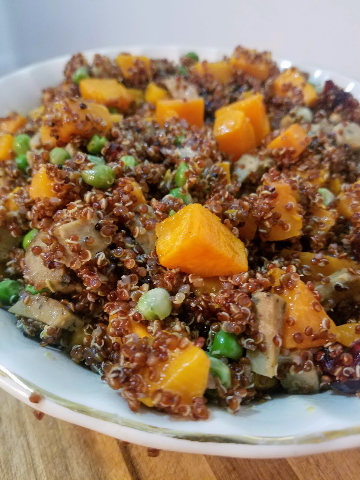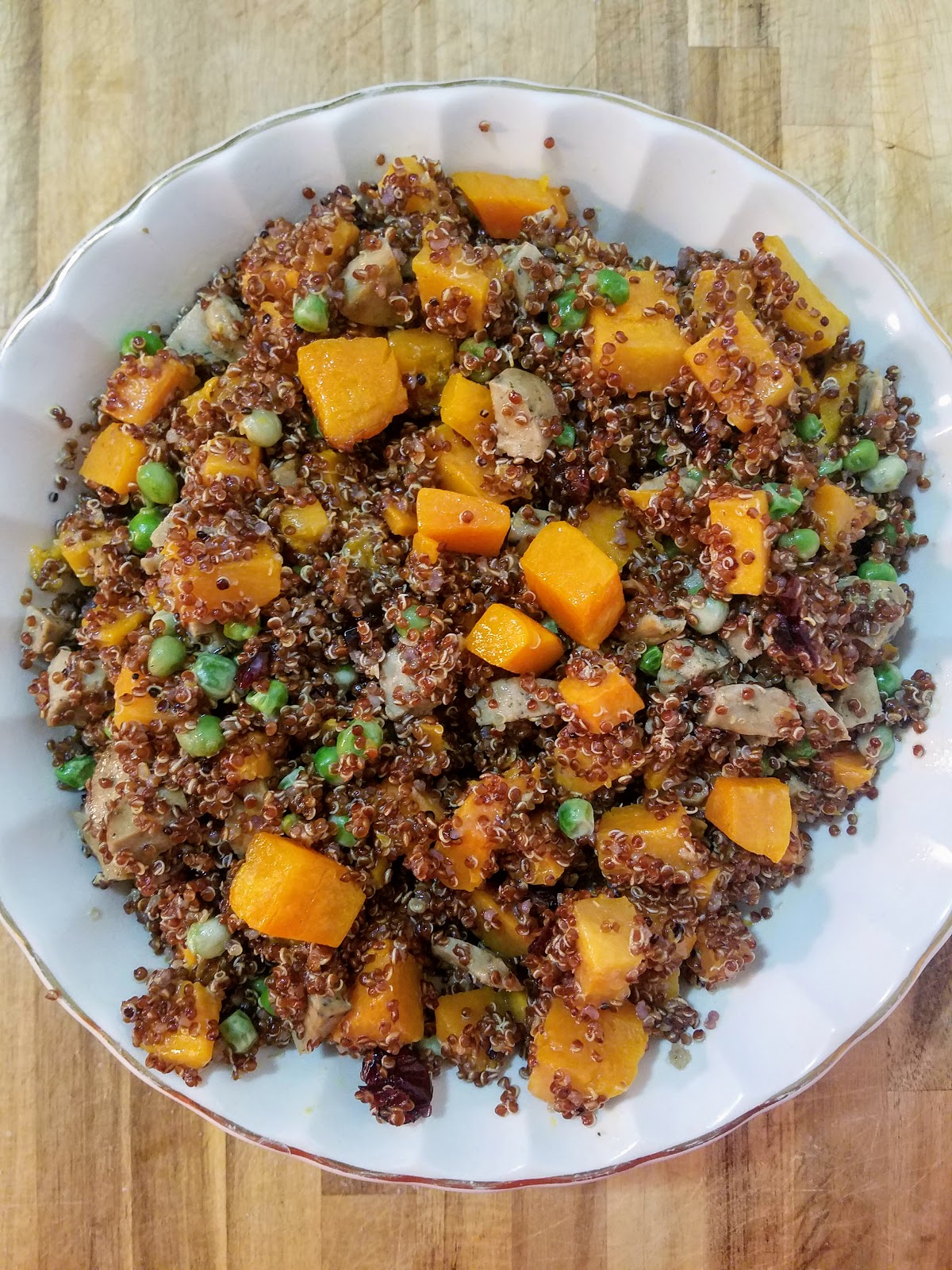 I feel like I haven’t cooked anything the whole month of December. I know that isn’t true, but it feels like we haven’t had a “normal” meal in a long time. It feels good to start to get back to the routine and eat our familiar and healthy homemade dinners again. This warm quinoa salad with butternut squash, veggie sausage, and dried cranberries is a delicious and easy winter meal that is healthy and satisfying.