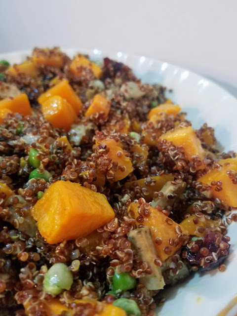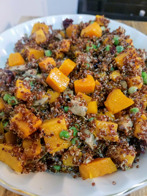 Preheat oven to 350 degrees. On a baking sheet, place butternut squash and drizzle with 2 Tbsp olive oil and sprinkle with salt. Toss to coat. Roast in the oven for 15-20 minutes or until tender, tossing halfway through. Meanwhile, in a saucepan, cook quinoa in 2 cups of simmering water for about 15 minutes or until the quinoa is fluffy and all the water is absorbed. In a small skillet over medium heat, heat sausage for about 3 minutes, stirring occasionally, and then add frozen peas for an additional 3-5 minutes or until warm. Set aside. In a measuring cup, whisk together 2 Tbsp olive oil, Dijon mustard, maple syrup, apple cider vinegar, and salt and pepper. In a large serving bowl, toss quinoa, butternut squash, dried cranberries, sausage and peas. Drizzle dressing over the top and toss again to evenly coat. Serve immediately.