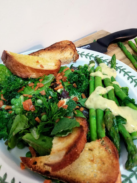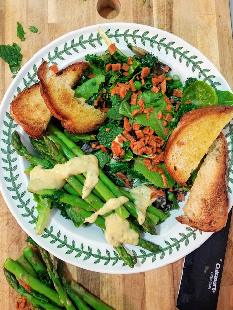 To assemble, place kale and peas, spring mix, mint, and dill leaves in a large bowl. Add a little less than half of the dressing and toss to coat. On two plates, evenly split the salad mixture, the asparagus spears, the fake bacon bits if using, and the grilled bread slices. Add another drizzle of dressing over the asparagus spears if desired and serve.