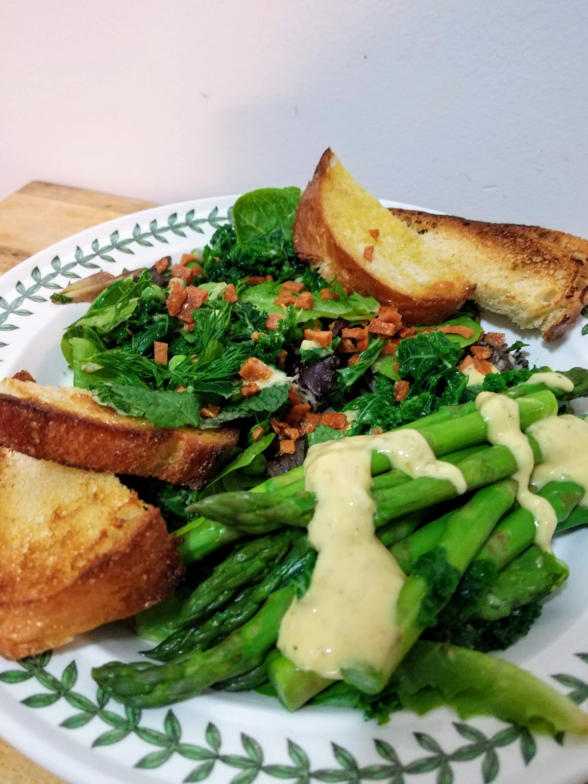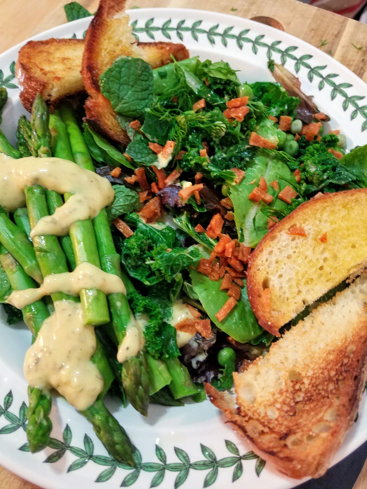 To assemble, place kale and peas, spring mix, mint, and dill leaves in a large bowl. Add a little less than half of the dressing and toss to coat. On two plates, evenly split the salad mixture, the asparagus spears, the fake bacon bits if using, and the grilled bread slices. Add another drizzle of dressing over the asparagus spears if desired and serve.