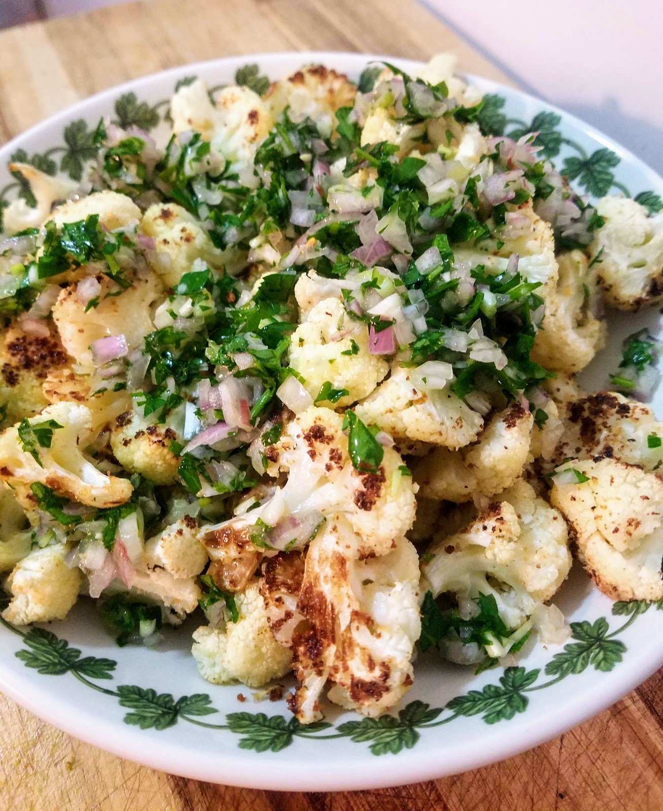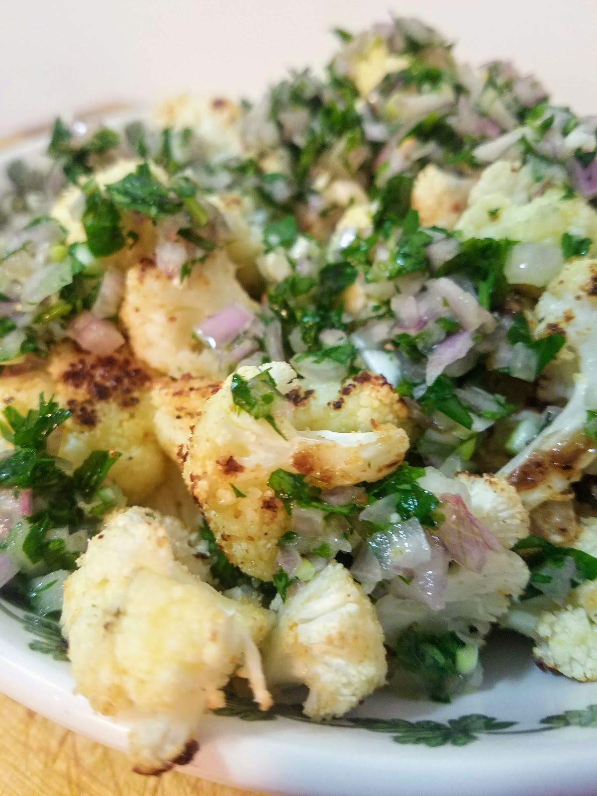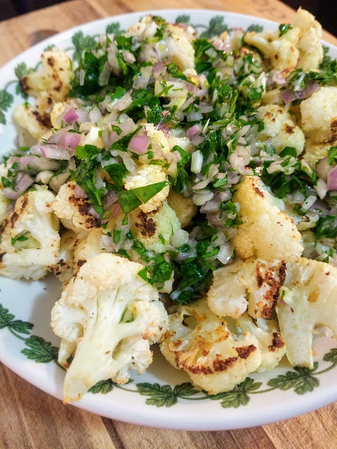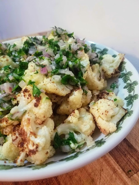 Crispy cauliflower with fresh Salsa Verde is a yummy side dish perfect for a normal week night or for serving to guests. A fresh salsa verde made from chopped herbs, shallots, lemon juice, and olive oil is such an easy trick for dressing up your average plate of roasted veggies.