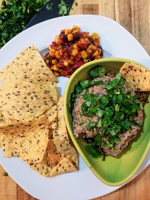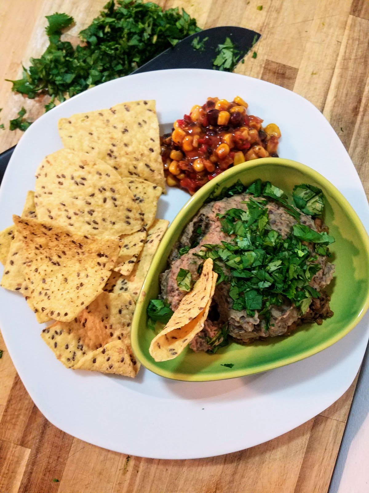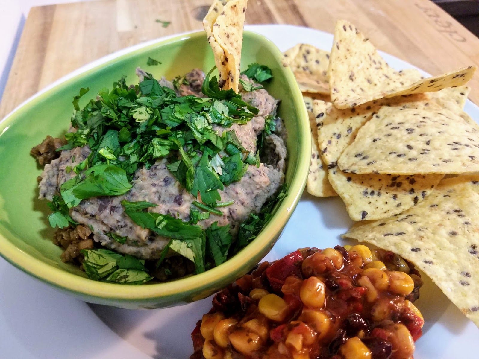 In a small saucepan over medium high heat, add olive oil, jalapeno, celery, and garlic. Saute for 2-3 minutes or until softened. Add black beans, paprika, cumin, cayenne, a dash of salt, and lime juice. Stir and let cook for another 2-3 minutes. Transfer mixture to a food processor and add vegan cream cheese. Puree until mostly smooth, then add half of the chopped cilantro, and process again until mixed in. In the same saucepan over medium heat, add the groundless beef and allow to heat through, stirring often to avoid sticking to the bottom. To assemble, spread a layer of groundless beef on the bottom of the dish, top with the black bean mixture, and top with the rest of the chopped cilantro. Serve with tortilla chips and spicy salsa if desired.