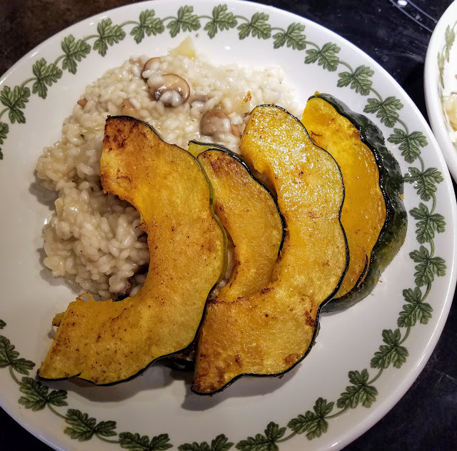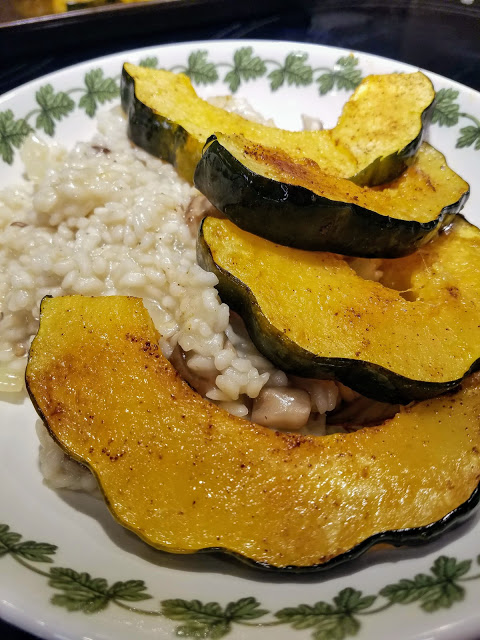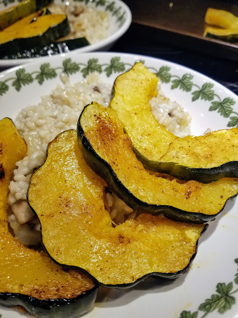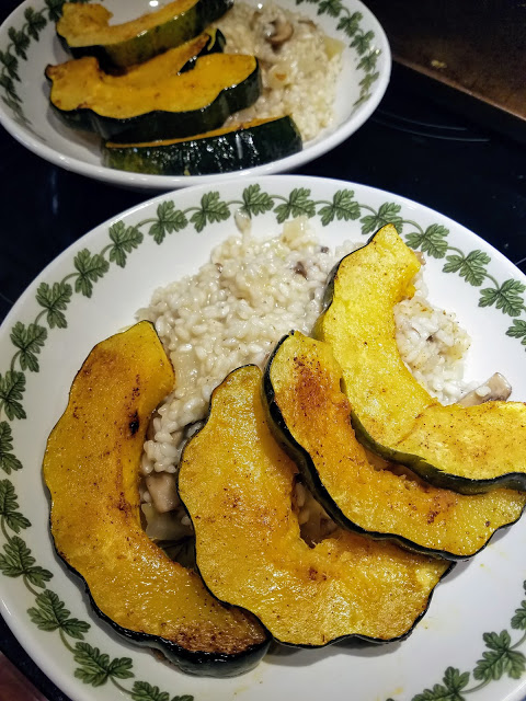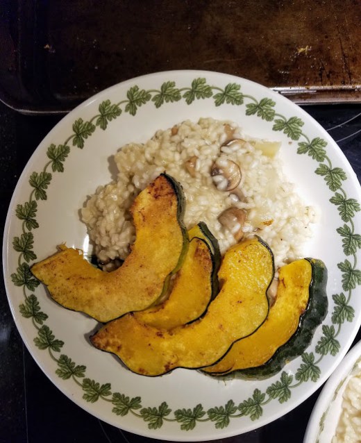 Risotto is one of my go-to dinners. It’s so easy, very pantry friendly, and can take on different lives based on what you pair it with and what flavors you choose to explore. We had an acorn squash just waiting to be roasted into gorgeous tender slices, and when paired with a creamy bowl of risotto — voila!– a meal is born.