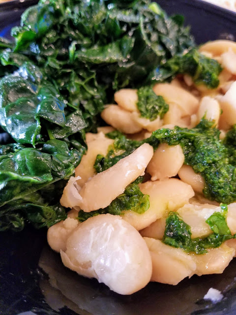 Serve beans with spinach pesto drizzled on top, and alongside some lightly sauteed Italian kale and a few slices of hearty bread, if desired.