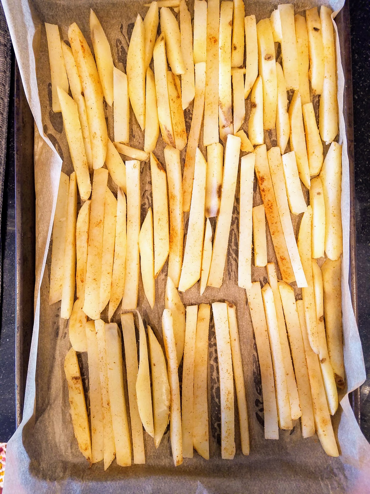 While I was at it, I decided to season the fries with Cajun seasoning. Seasoned fries are inarguably *SO* much better than regular fries, and it seemed like such an easy thing to do. I’m sure our future selves will thank us when they bite into these spicy garlicky fries crisp from the oven.