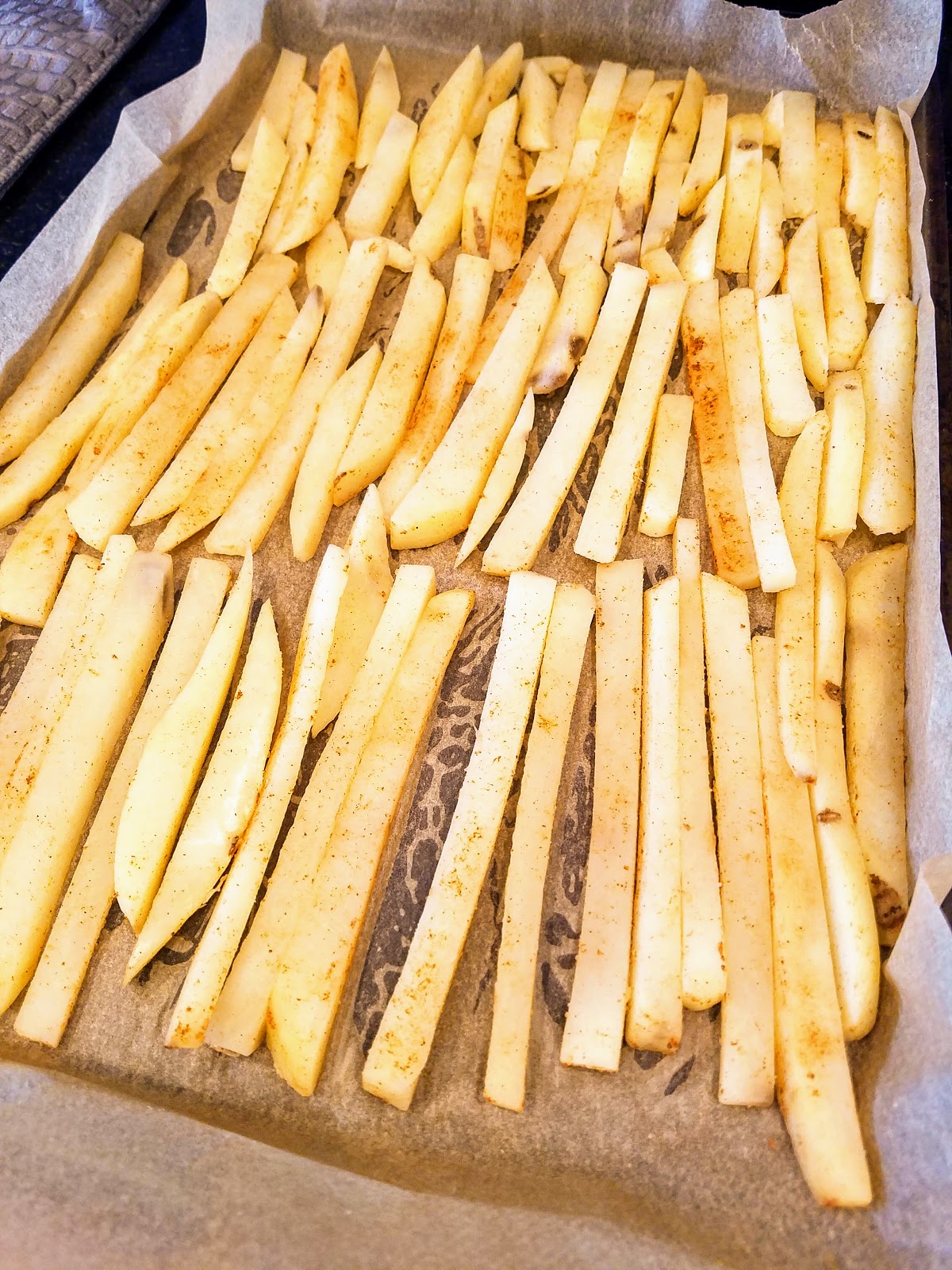 You have to freeze them in stages, starting with a flat layer so that they don’t freeze all in one clump. Then you can transfer them to a plastic bag, labelled with the cooking instructions if you’re a smarty pants! Feel free to scale this up if you have a big family or just really love oven fries. π