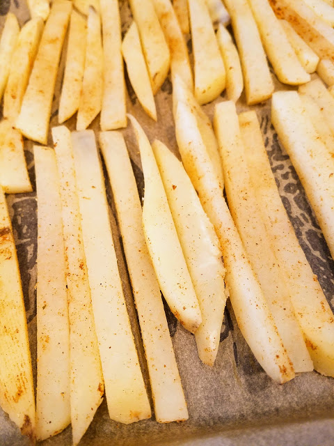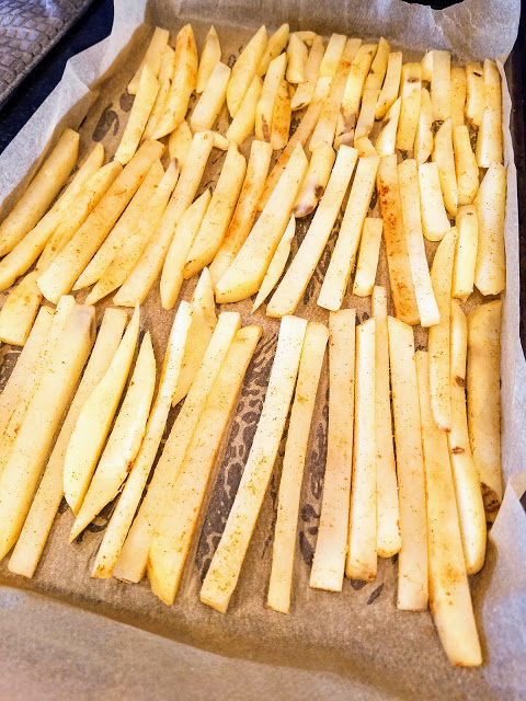 To make fries, bake in a 400 degree oven for 15 minutes, tossing once to ensure even crispness. They will be crispier if they are well spaced on the baking tray without touching. Enjoy!
