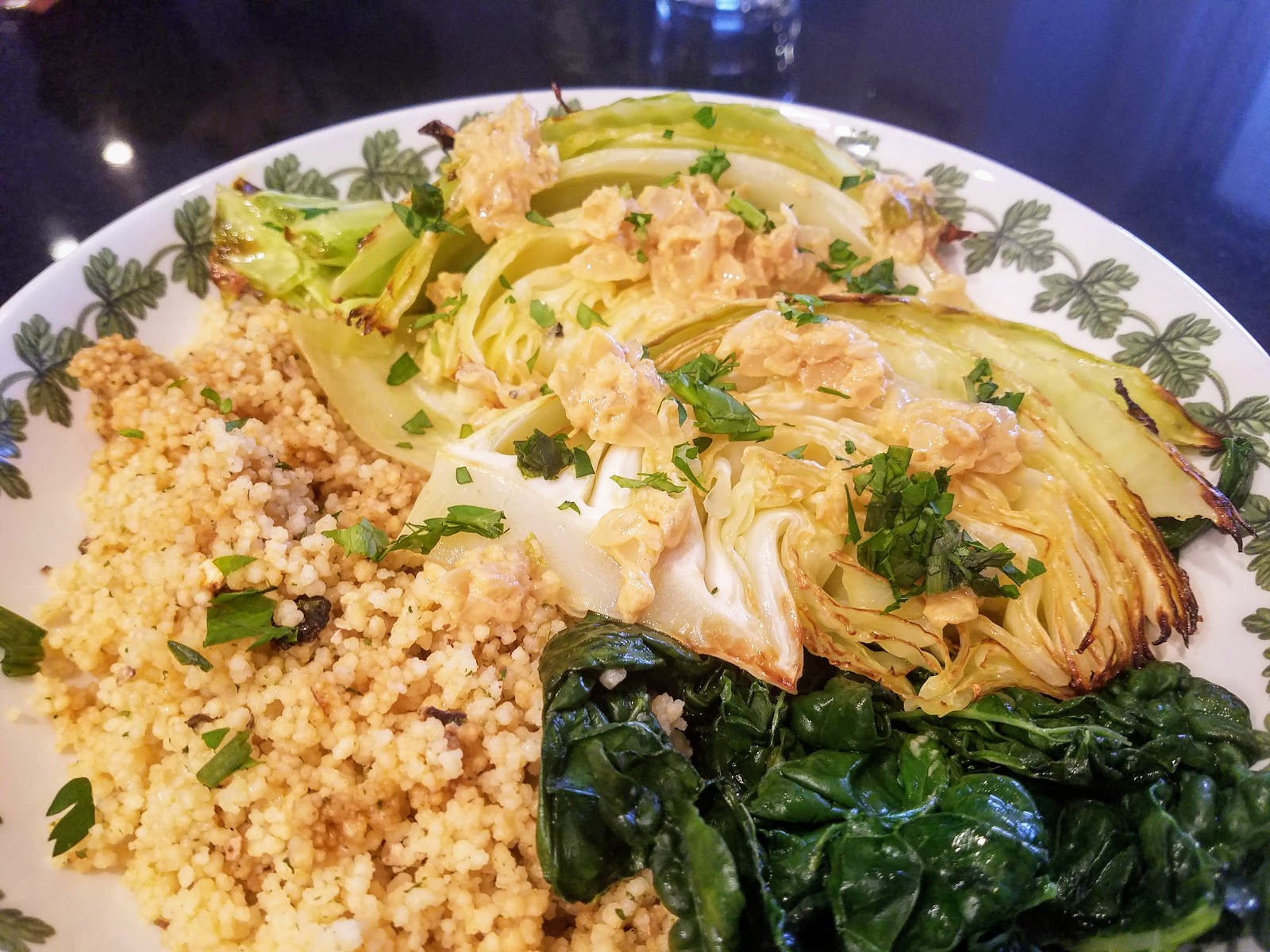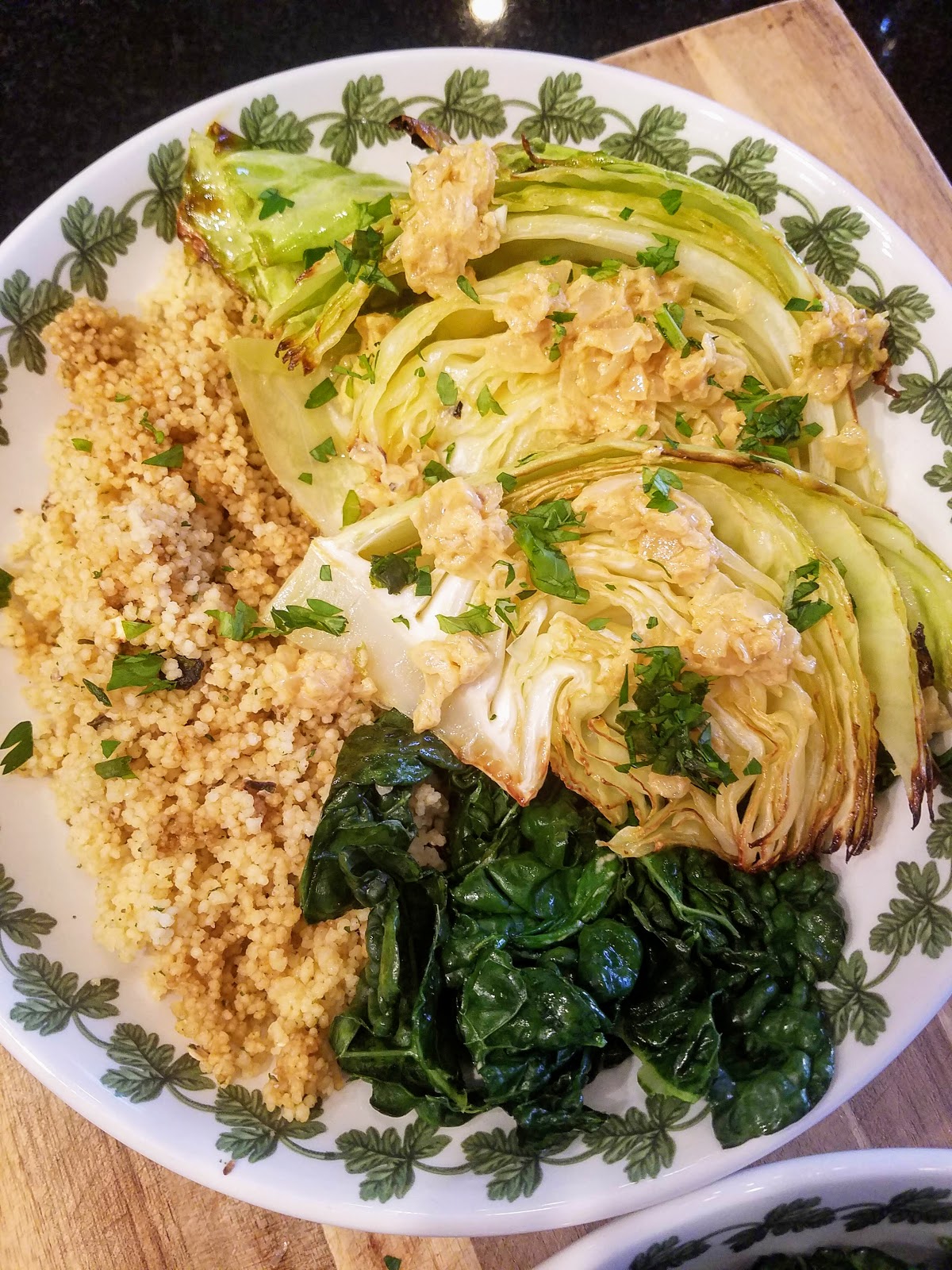 The onion Dijon relish is a quick and simple flavor booster. It balances the sweet roasted cabbage with a touch of acid and the warm subtle spiciness of Dijon mustard. The creamy texture also works really well with the still slightly crunchy cabbage leaves. We served ours with fluffy couscous and some simple kale, which was delightful!
