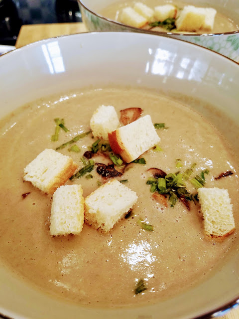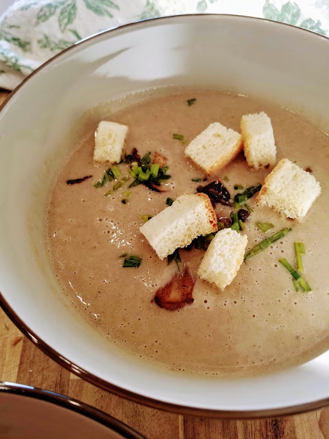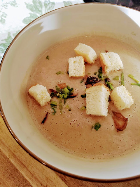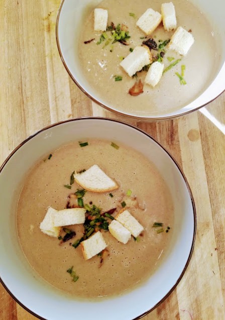 In a blender, carefully pour the rehydrated mushrooms and their broth, the coconut cream mixture, and a splash of red wine vinegar. Place a kitchen towel over the lid and blend until smooth. Split between two bowls and garnish with remaining mushrooms, chives, and croutons.