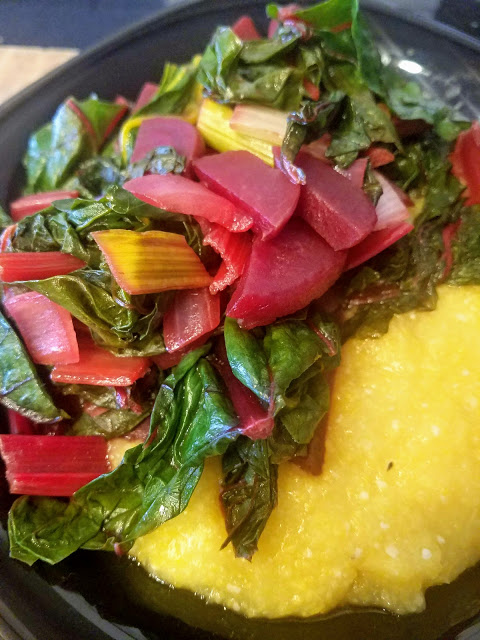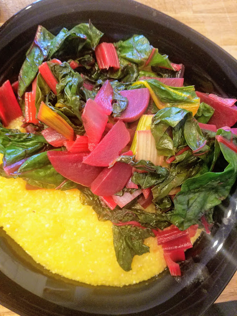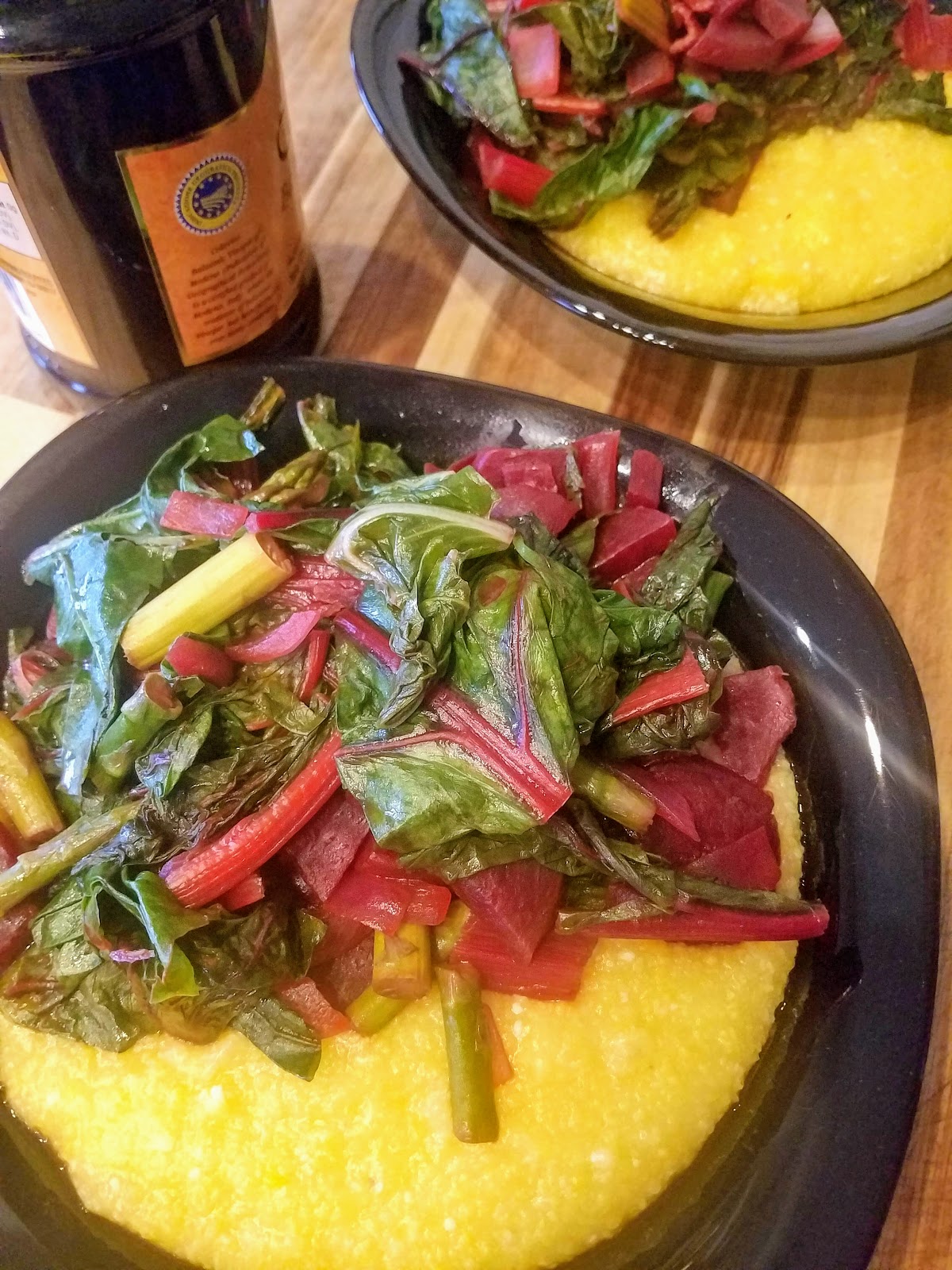 I cooked the rainbow chard with other colorful vegetables: deep red canned beets, pretty purple red onion, and bright green asparagus. And don’t forget the bright yellow polenta, which served as the base for my dish in this case. Balsamic vinegar brought out all of the different flavors and added its signature tart sweetness. Delicious!