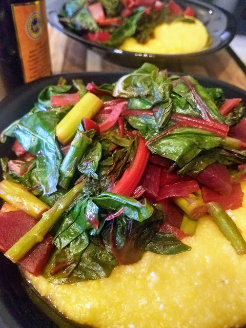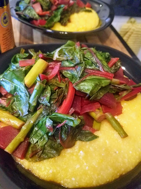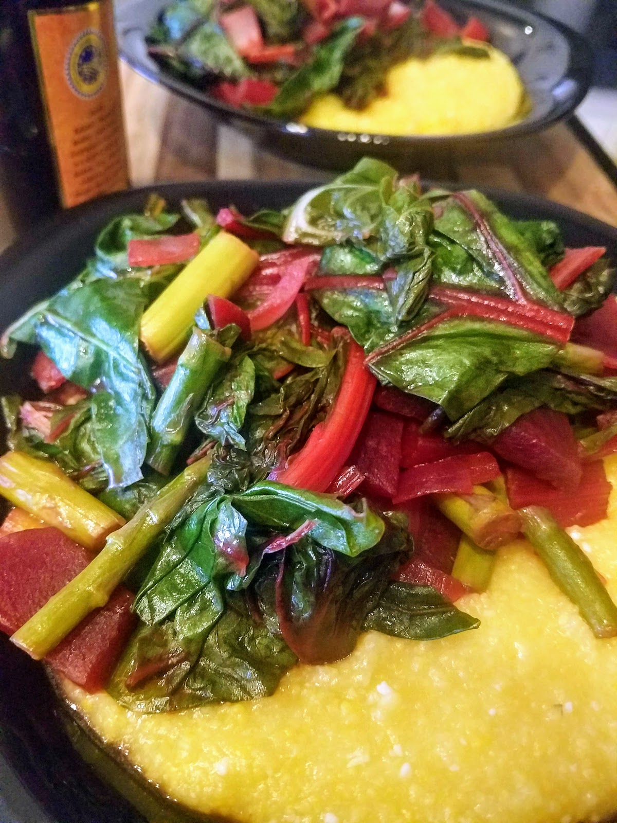 In a deep skillet with a tight fitting lid, add olive oil and place over medium heat. Add chard stems, red onion, and asparagus and saute for a few minutes until softened. Add chard leaves, balsamic vinegar, a pinch of salt, and cover for a few minutes. Once the leaves have wilted to half the size, turn off heat and fold and stir everything together for another 1-2 minutes. Serve over polenta or another grain if desired.