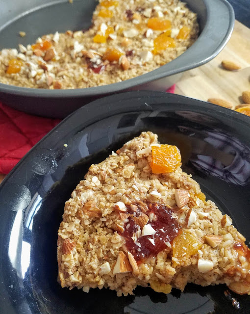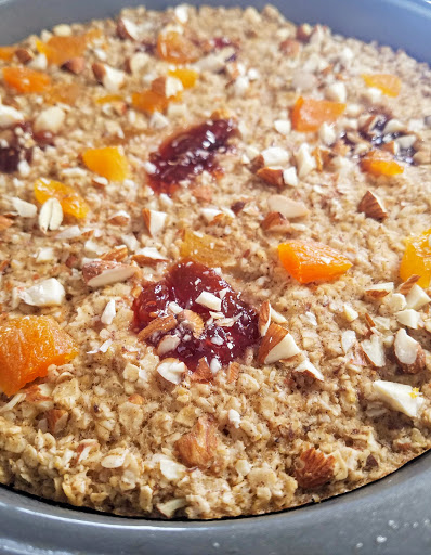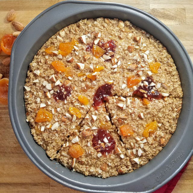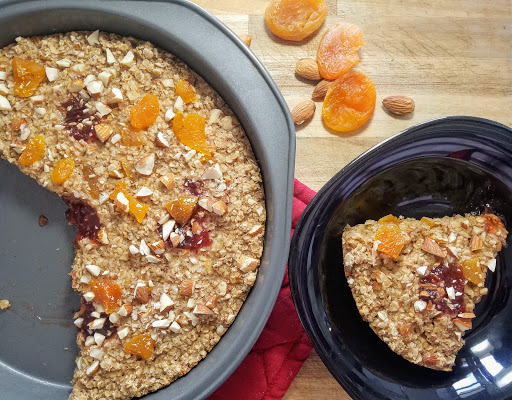 Preheat the oven to 350 degrees. Lightly grease a cake pan and set aside (I used a 9″ round, but 8″ square would work too). Mix together the flax seed meal and warm water in a small bowl and set aside for a minute to congeal. In a large bowl, mash the banana, and mix with flax egg, coconut oil, almond milk, vanilla, maple syrup, oats, cinnamon, and baking powder. Fold in two thirds of the chopped almonds and dried apricots. Pour the mixture into the prepared pan and top with a few dollops of raspberry apricot jam. Sprinkle with remaining almond and apricot bits. Bake in the oven for 20-25 minutes or until golden brown and firm. Let sit for 5 minutes to firm up even more. Cut into slices and serve!