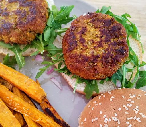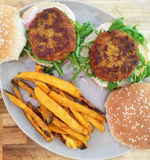 A tablespoon of curry powder and dashes of cumin and cayenne pepper create a new dimension with their subtle warmness and spice. They complement the lentils and sweet potato really well. I suggest you top your patties with fresh arugula and red onion, and enjoy with homemade sweet potato fries and fresh salad. Enjoy π