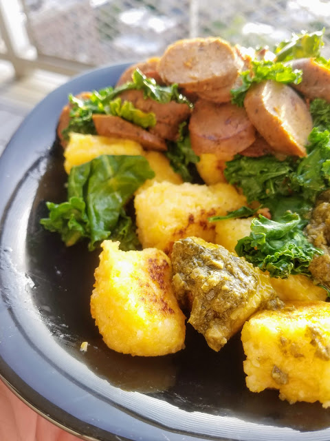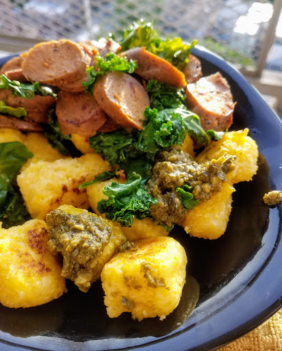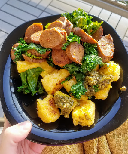 In a large bowl, break up cooled polenta by scraping with a fork. Add flour and use your hands to incorporate it into the polenta and knead gently until a dough is formed. Separate dough into five equal parts and use your hands to form long and thin cylinders (like snakes). Cut each cylinder into one inch pieces of gnocchi. In a large frying pan, heat olive oil over medium high heat. Swirl the oil so that it coats the bottom of the pan. Add gnocchi to hot pan and fry on each side for 2 minutes or until golden brown. Serve topped with a dollop of vegan pesto with sauteed kale and vegan sausage if desired.