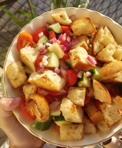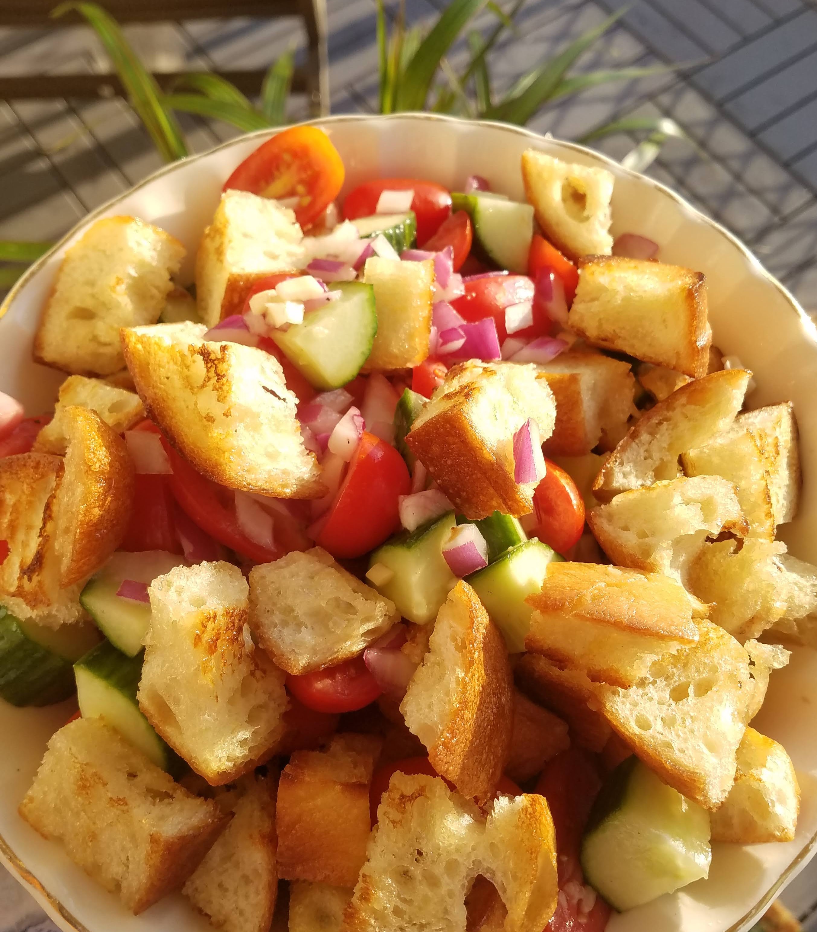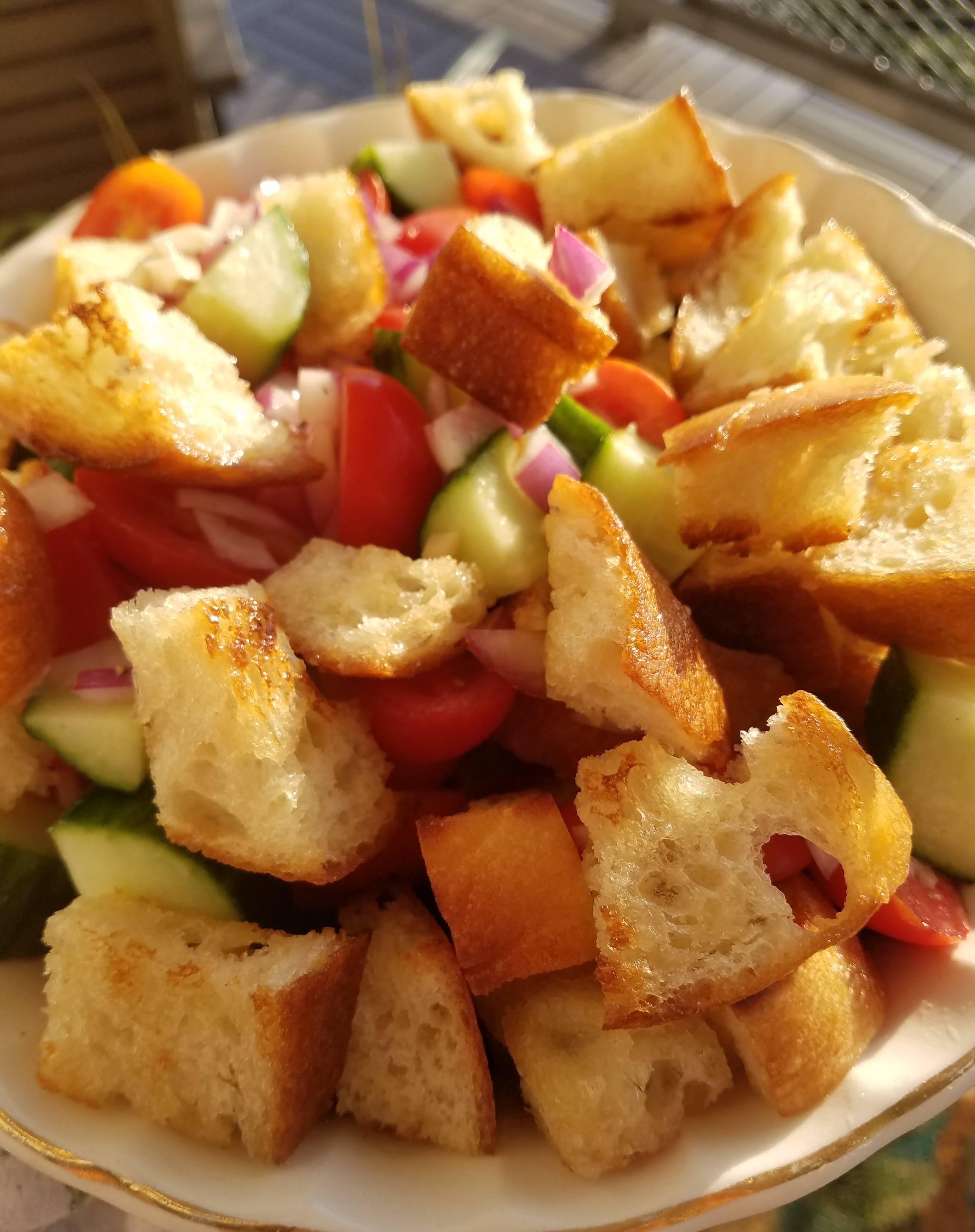 Panzanella is the most divine Tuscan salad made with cubes of crusty (stale) bread, tomatoes and onions. The dressing is a simple vinaigrette made with olive oil, vinegar (I used sherry vinegar but red wine vinegar would also taste great), a touch of sweet maple syrup, and of course, salt and pepper — and that’s it! It is the perfect dish for succumbing to the summer heat, and comes together in just minutes.