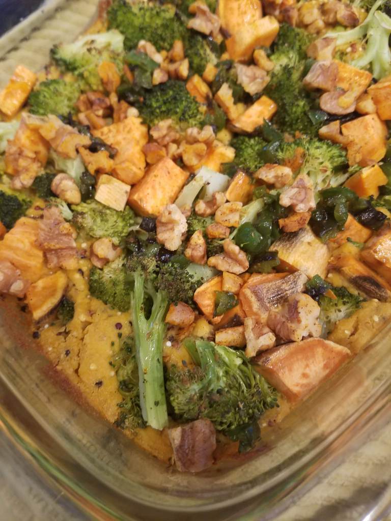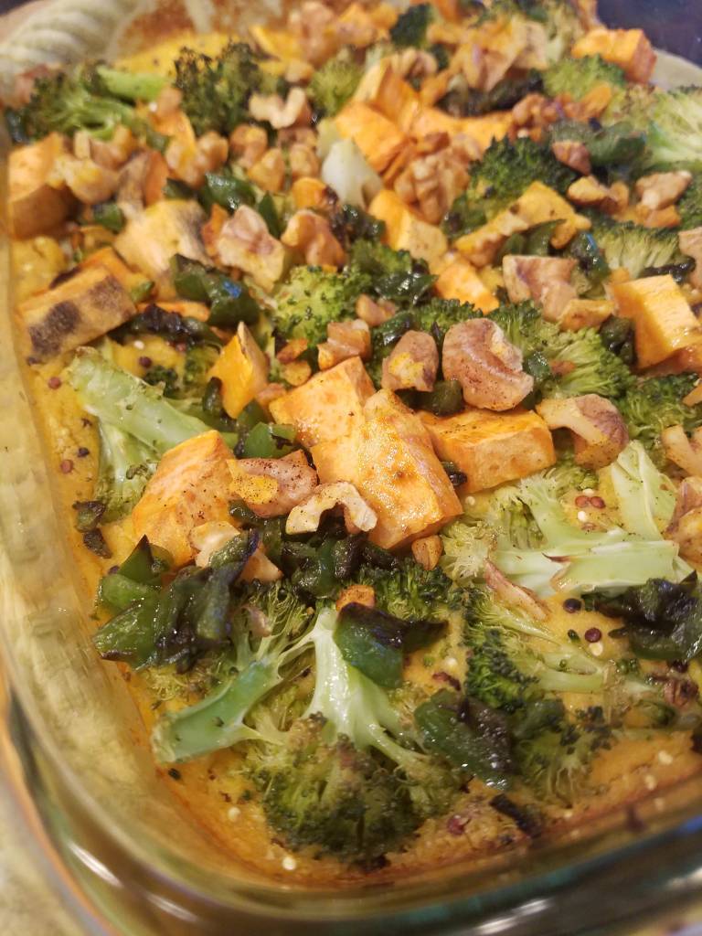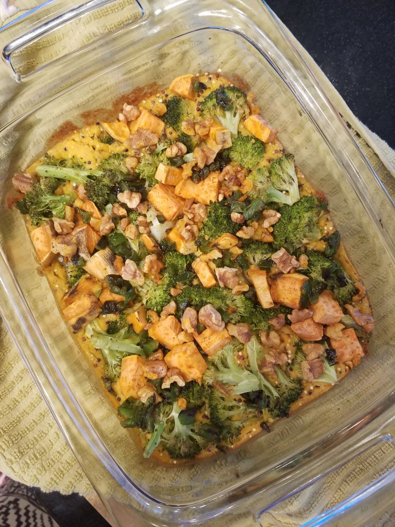 I’m trying to work on my casserole game, especially since I have recently acquired a few new beautiful baking dishes and I want to make use of them! Fit Foodie Finds inspired me with their recipe for a broccoli and cheese casserole, which I have adapted here to better fit our tastes and our pantry. I am in love this easy vegan sauce, which uses a combination of sweet potato, cashews, and nutritional yeast to make a rich and “cheesy” sauce you could re-purpose for lots of different dishes.