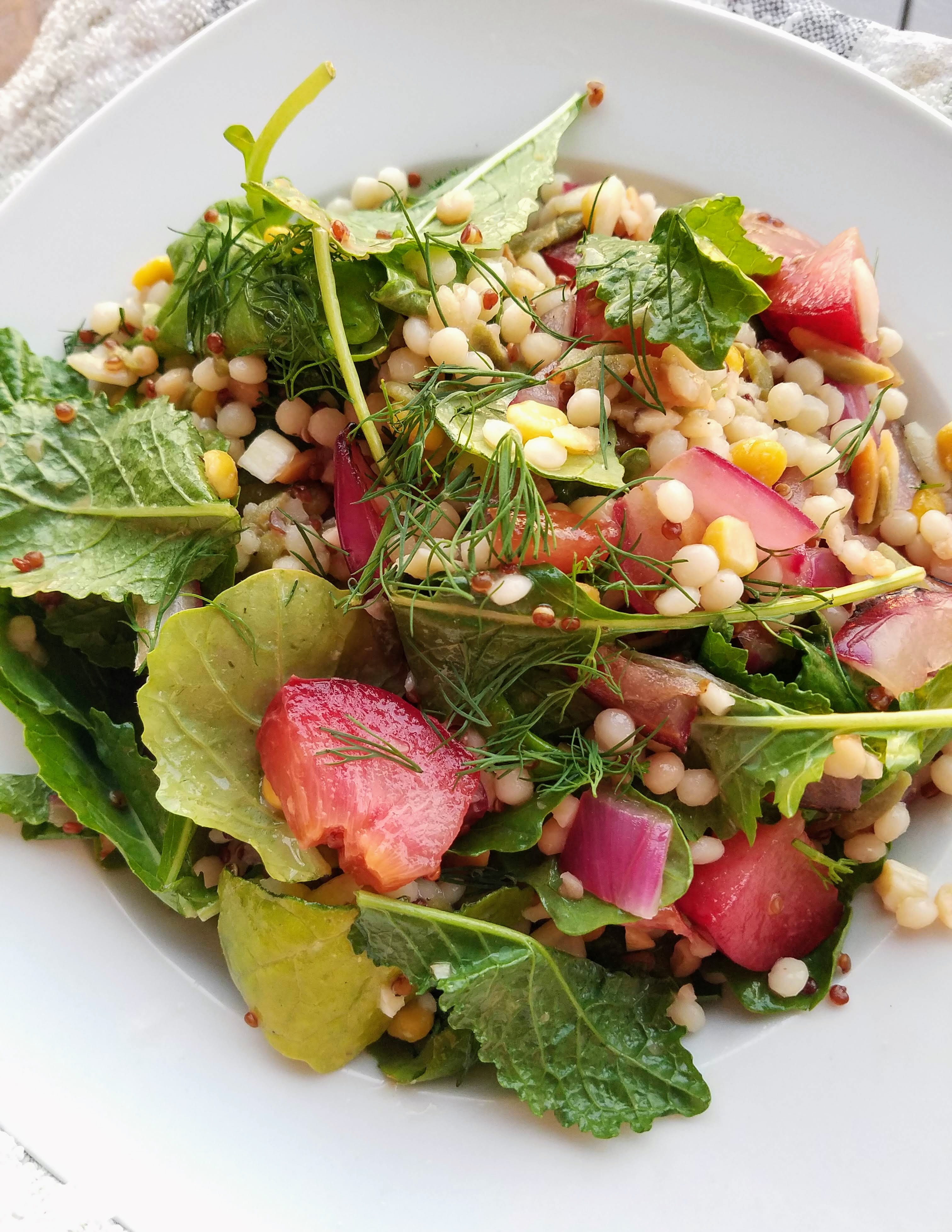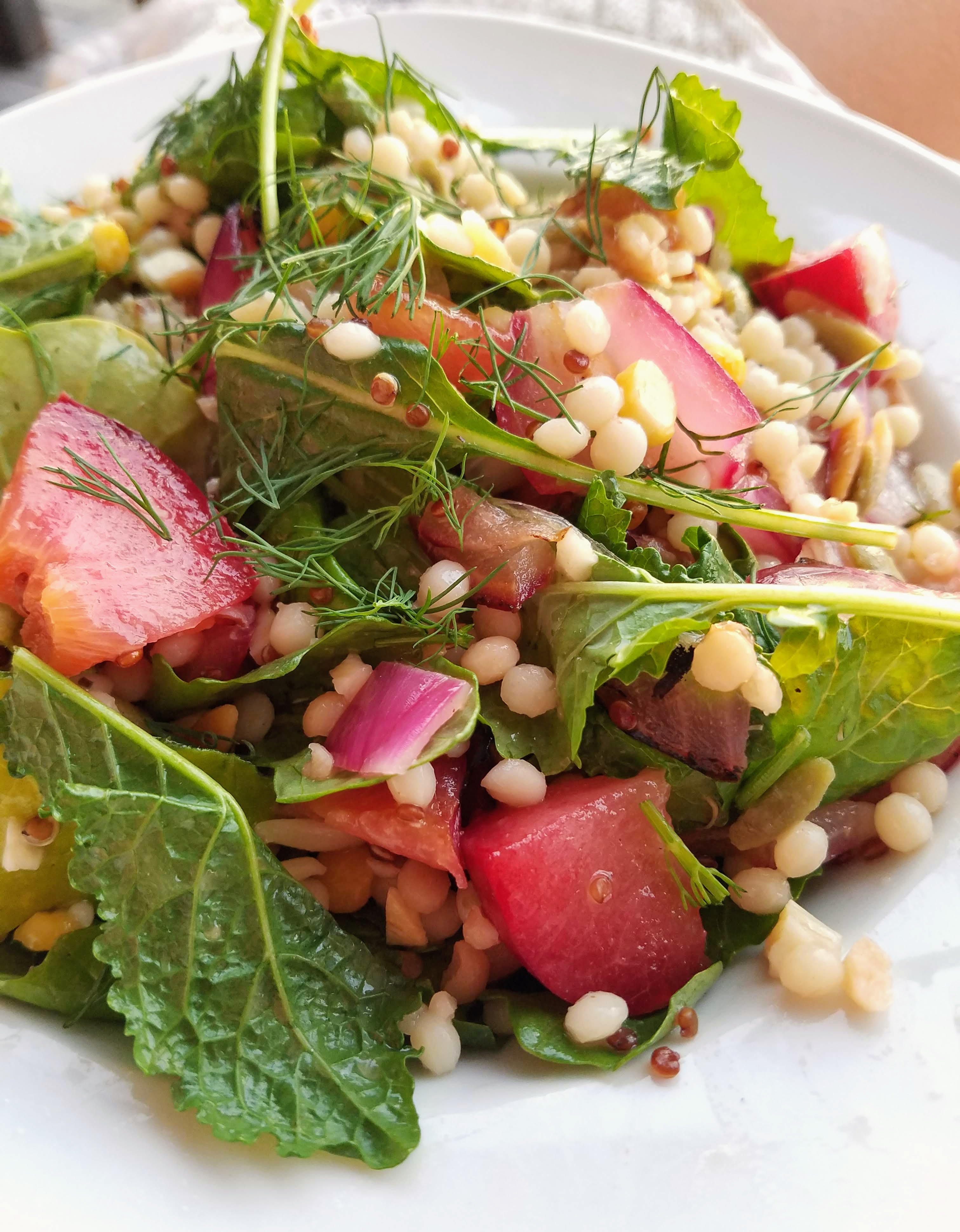 We don’t have a grill in our apartment, so I improvise by grilling in a dry skillet over hot heat. I used this method for the plums and red onion in this salad, and they ended up having a lovely char. To balance the sweetness from the plums, the salad is dressed in a tart white balsamic vinaigrette that brings it all to life. Baby kale and easy grains add texture and substance, and lastly, fresh dill tops it off with a burst of flavor.