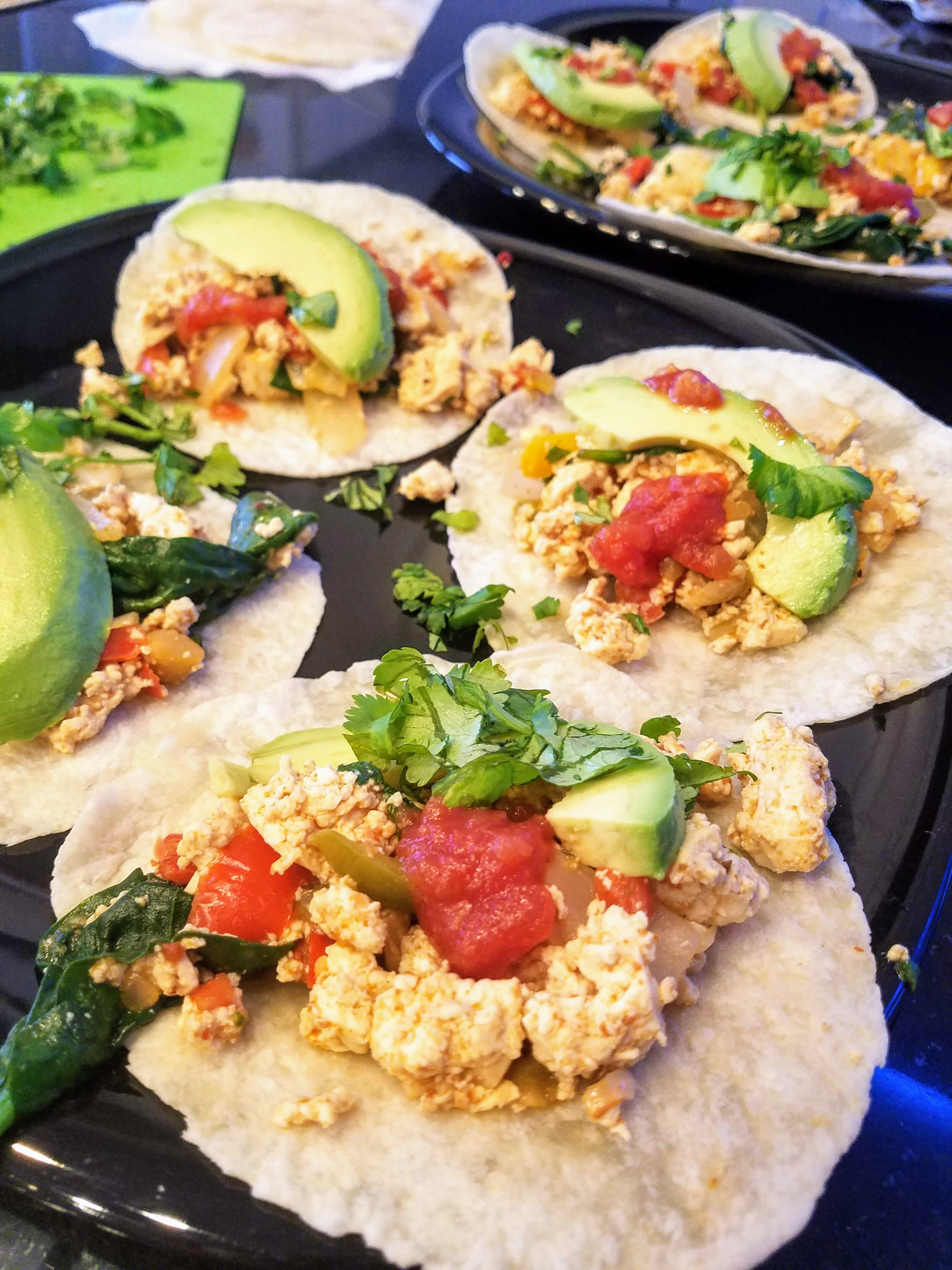 Preheat large skillet over medium high heat. Heat up olive oil and add onion and garlic. Saute for a few minutes until lightly softened. Add frozen pepper strips and green chiles and saute for a few more minutes, until pepper strips are warmed through. Crumble in tofu and add soy sauce, salsa, and taco seasoning. Stir to incorporate and reduce heat to medium low, cooking for a few more minutes to allow flavors to meld. In the last minute, fold in spinach and cilantro until spinach is wilted. Wrap tortillas in a damp paper towel and microwave for 30-40 seconds. To assemble, spoon some tofu mixture into each tortilla and top with a dollop of salsa, chopped cilantro, and sliced avocado.