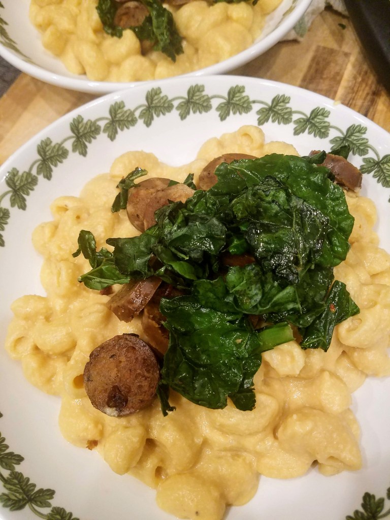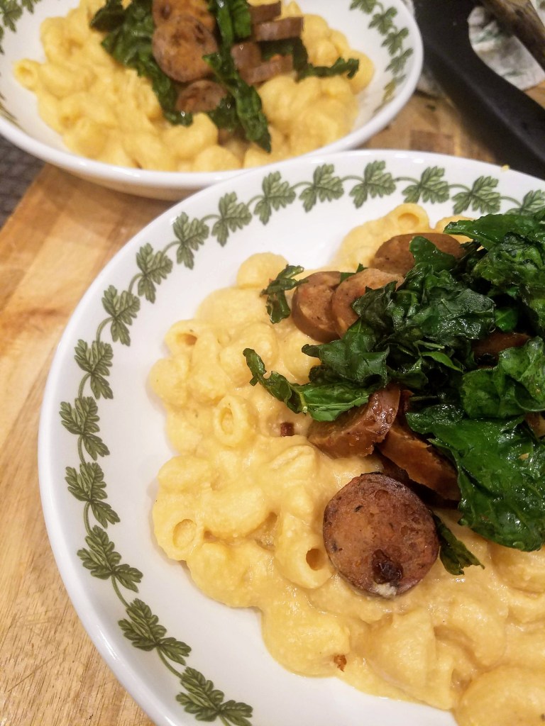 Cauliflower florets and raw cashews are simmered in a bath full of big flavors and unsweetened almond milk, and then blended together to form a thick and cheesy blanket for the macaroni. It couldn’t be simpler. We topped ours with some sauteed veggie sausages and kale for added texture and nutrients, but honestly, the mac n’ cheese would be just as good served solo! And since it has cauliflower and cashews, it covers your veggie and protein needs all by itself.
